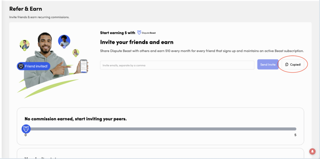 Getting started is easy! Once you have your credit monitoring affiliate link, simply share it with your friends. When they sign up for credit monitoring through your link, they’ll get access to Dispute Beast for free—and you’ll start earning $10 per month for each referral.