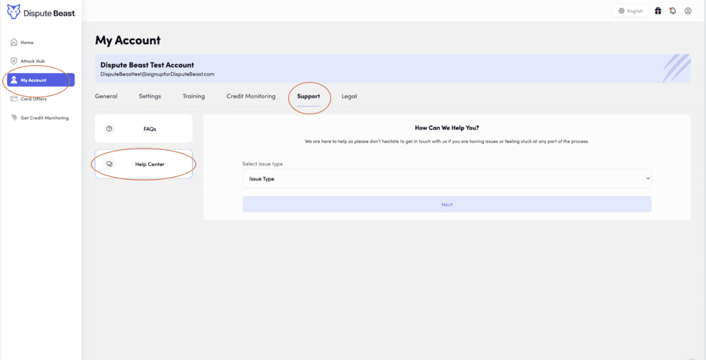 • Inside Your Dispute Beast Portal: You can also contact us directly from your Dispute Beast portal within the settings area.